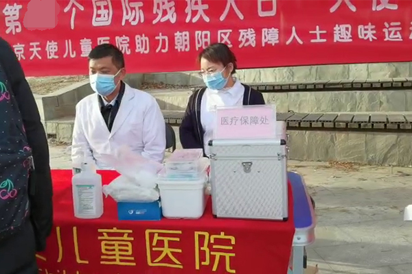病情问诊2020年11月28日,为迎接第29个国际残疾人日,北京朝阳区举办“薪火常伴 携手共营”为主题的活动在常营公园举办。我院医疗团队为参赛的残联人士提供全程的医疗保障工作,为确保在场志愿者、运动员、及残障人士的竞技安全。