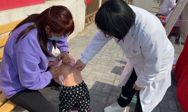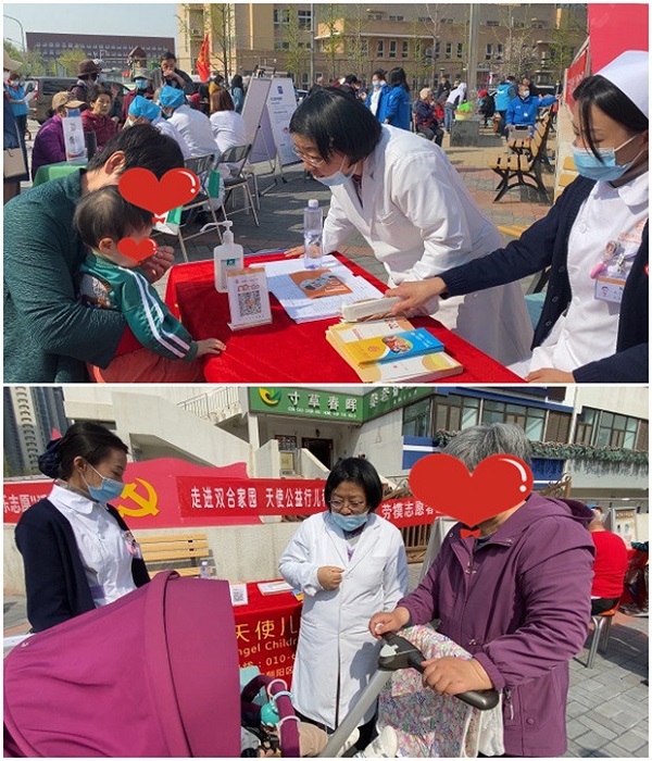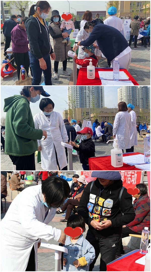 北京天使儿童医院医护人员提前准备好桌椅、登记本、检查物品等,为现场的儿童免费测身高、测体重、预测成年身高,并普及生长发育科普小知识。