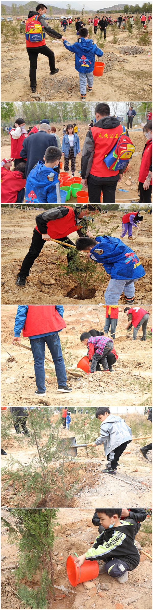 上午10点,来到青龙峡退耕还林区,在工作人员和公益团队的安排指导下,孩子们瞬间进入角色,热火朝天地种起树来。你一锄头,我一铲子,忙得不亦乐乎。待挖好半米深的坑后,把小树放入坑内,孩子们争先恐后地给树苗培土,不一会儿,一棵棵小树就站了起来,孩子们纷纷汲水浇灌小树,并许愿着小树快快长大。