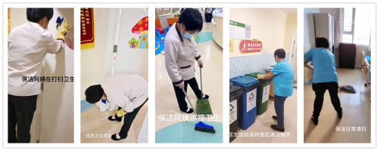 每天为保持我院的良好卫生环境默默无闻的尽一份力,在这平凡之中蕴藏着无私与奉献 。 她们不怕苦 、不怕累 、把医院的每一个地方都打扫的干干净净,从不放过一处角落,从不落下一丝灰尘,没有死角,这是勤劳伟大的保洁阿姨辛勤劳动的结晶。